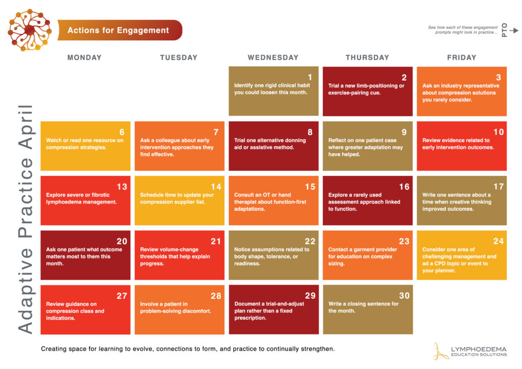 Our monthly Actions for Engagement calendars offer practical prompts to support reflection, connection, and thoughtful action in practice with a focus on improving care for people living with lymphoedema and chronic oedema.