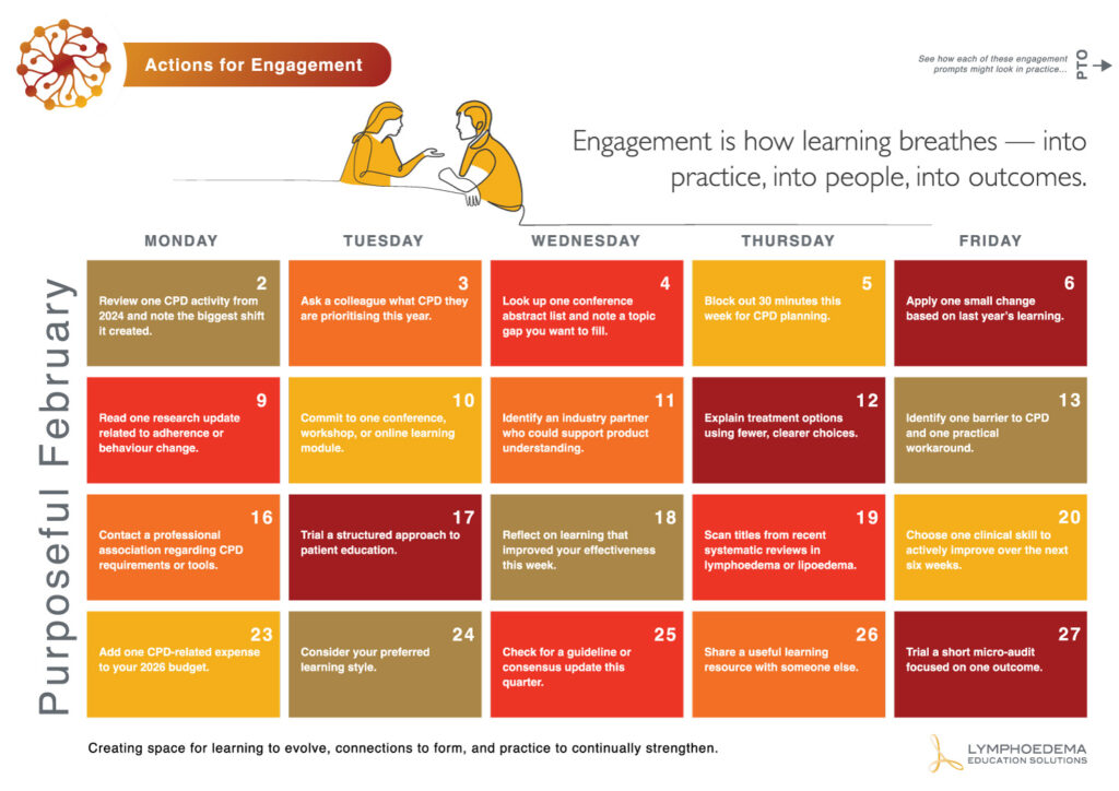 Our monthly Actions for Engagement calendars offer practical prompts to support reflection, connection, and thoughtful action in practice with a focus on improving care for people living with lymphoedema and chronic oedema.